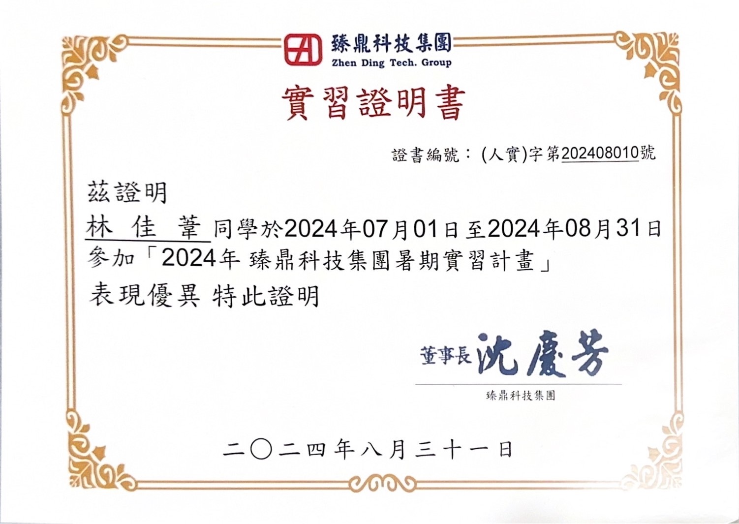 臻鼎實習證明